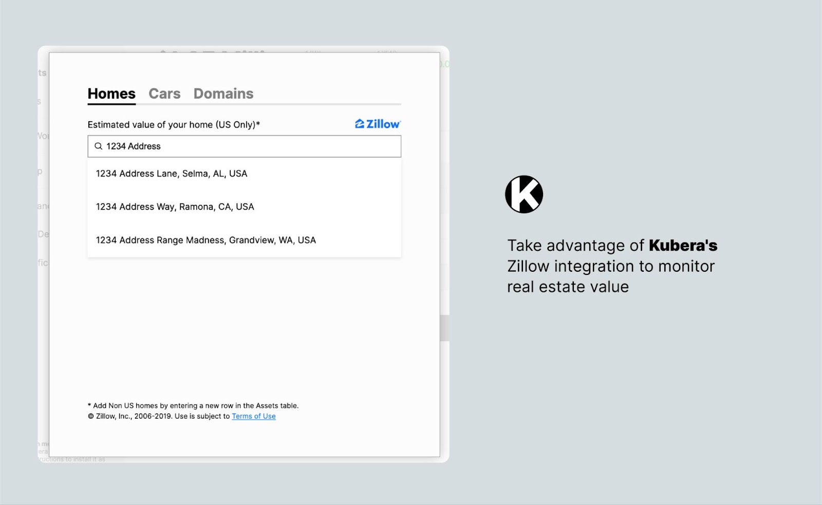 Other features include Kubera’s integrations with asset experts (EstiBot, Zillow, and more) that give you insight into and track the real-time value of assets like web domains and homes.