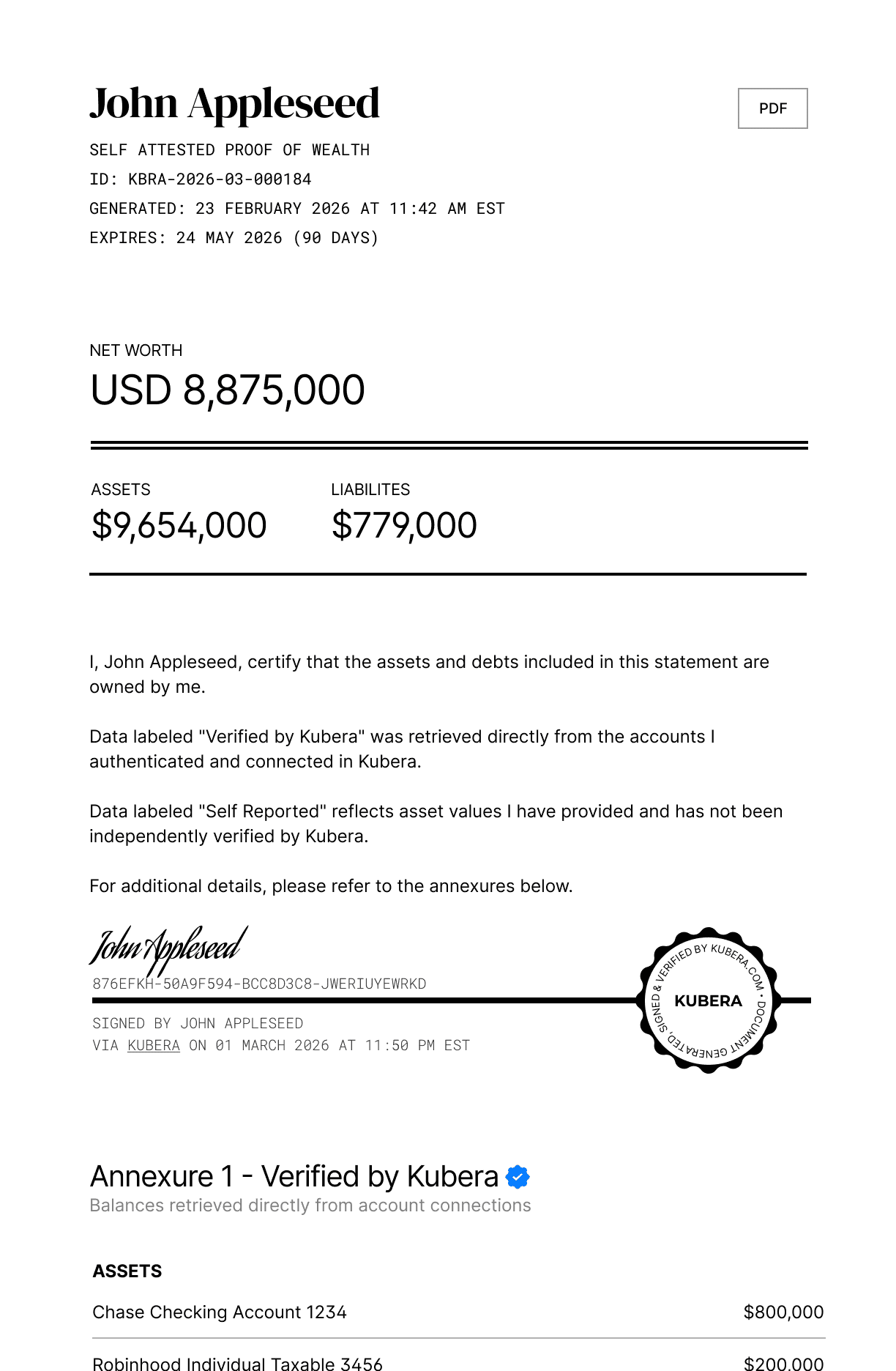 Generate Proof of Wealth Create a signed shareable statement of your assets, debts, and net worth as of a specific date. Remove things you don’t want included.